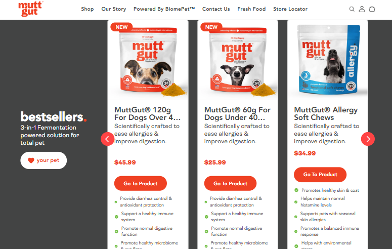MuttGut is a Shopify pet wellness store brand dedicated to improving digestion, immunity, and long-term vitality through science-backed nutrition. Powered by its proprietary BiomePet fermentation process, the brand delivers targeted gut health solutions for dogs, cats, and horses.